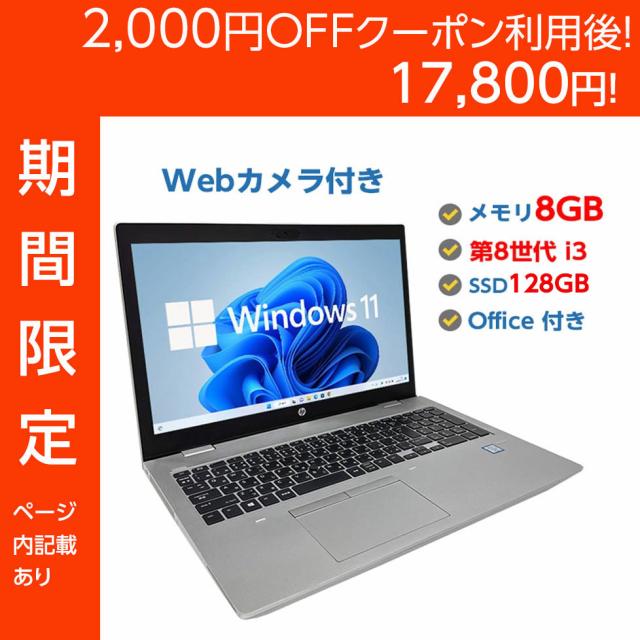 【2000円OFFクーポンで17,800円!】【正規品・Win11正式対応】Webカメラ付き ノートパソコン 中古 パソコン Windows11 高性能 第8世代 Core i3 メモリ 8GB SSD 128GB OFFICE付き Windows11/10 店長オススメ 高速SSD おまかせ 15.6型 無線LAN DVDドライブ