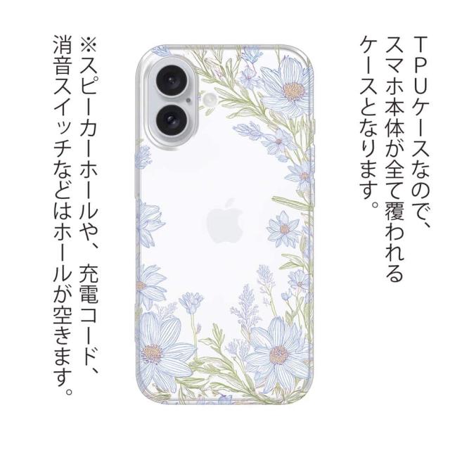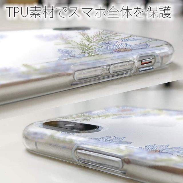 | 商品説明 | 落下や衝撃に強いTPUケース。スマホ本体の色が透けるデザイン。「No Name Flower Blue」がスマホとケースの間に挟む物を引き立たせます。スマホ本体のカラーを生かすように、イラストの間が透明(クリア)になっているデザインです。 |