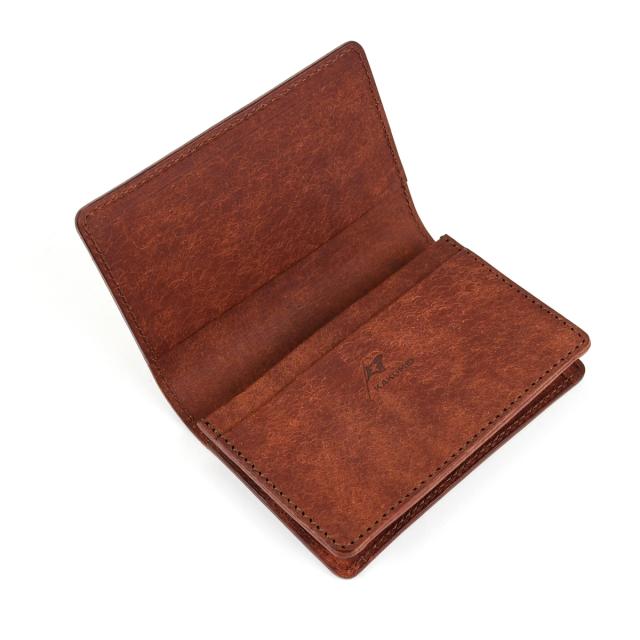 プエブロレザーのビジネスカードケースです。名刺入れは、お財布や他の革小物と比べて、頻繁に買い替えることがないレザーアイテムのひとつ。永く使うものだからこそ、スタンダードであることがキーポイントになります。ずっと使い続けたくなるような、シンプルで実用的の高いデザイン。収納面では、メインポケットを通しマチ仕様に。最近はスリムタイプも人気ですが、一枚でも多くの名刺を交換したい、というビジネスマンの要望に応えるには、やはり大容量であることが絶対条件です。フタ裏と手前のカードポケットは、受け取った名刺や社員証・IDカードの保管に役立ちます。