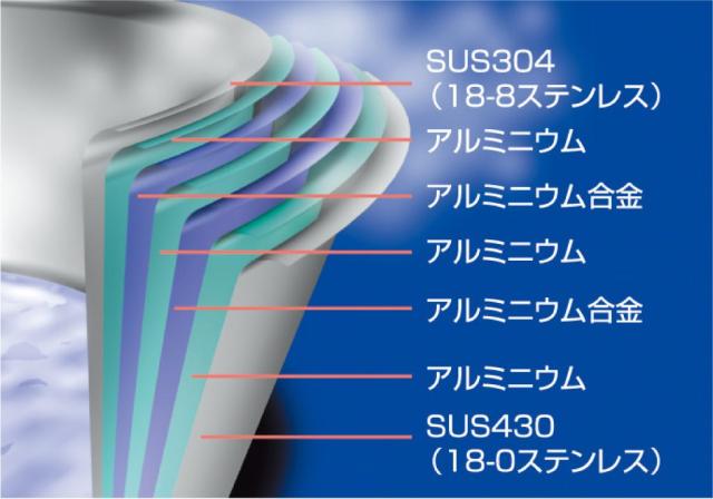 材質: 本体=全面7層構造(内側から18-8ステンレス/アルミニウム/アルミニウム合金/アルミニウム/アルムニウム合金/18-0ステンレス)