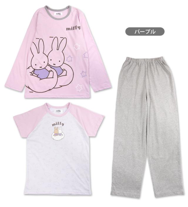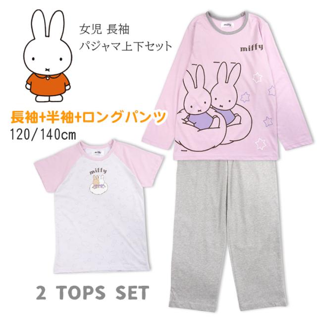 【メール便送料無料】miffy 長袖+半袖 パジャマ 上下セット キッズ 女の子 120 140 77321WH パープル 3点セット ミッフィー 長袖 長ズボン キャラクター 綿混 部屋着 寝間着 プルオーバー 丸首 Uネック 女児 幼児 子供 幼児 子ども 紫 ピンク グレー 9937