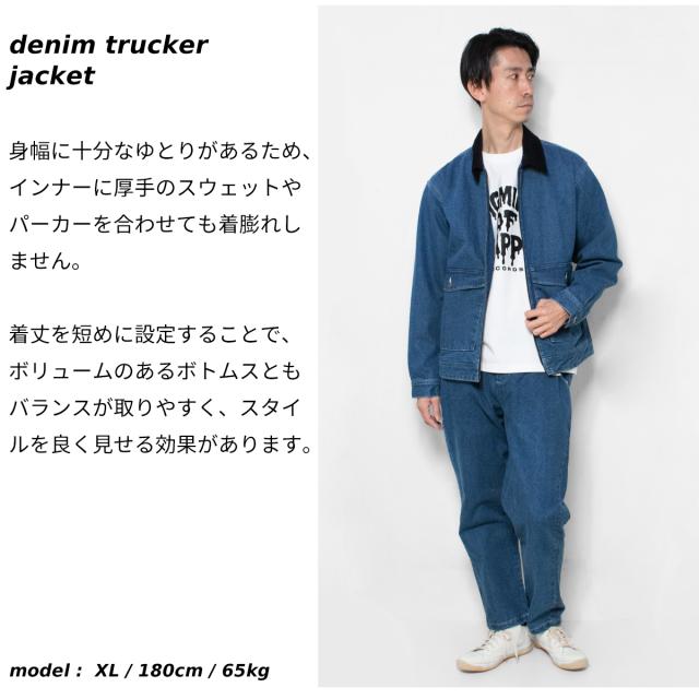 デニムと襟元のコーデユロイ生地をアクセントにしたクラシックなデニムトラッカージャケット。「着丈はすっきり、身幅はゆったり」とした絶妙なバランスが特徴。ヴィンテージのワークウェアを現代的なシルエットにアップデートしました。着丈を短めに設定することで、ボリュームのあるボトムスともバランスが取りやすく、スタイルを良く見せる効果があります。 素材はタフさと馴染みの良さを両立した、厚すぎず薄すぎない絶妙なオンスのデニムを使用。重厚感のある見た目ながら、着始めからストレスを感じさせない馴染みの良さがあり、ゴワつきが苦手な方でも着用しやすい質感です。洗濯や着用を繰り返すことで自分だけの「味」が出るエイジング(経年変化)を楽しめるのも魅力です。 |