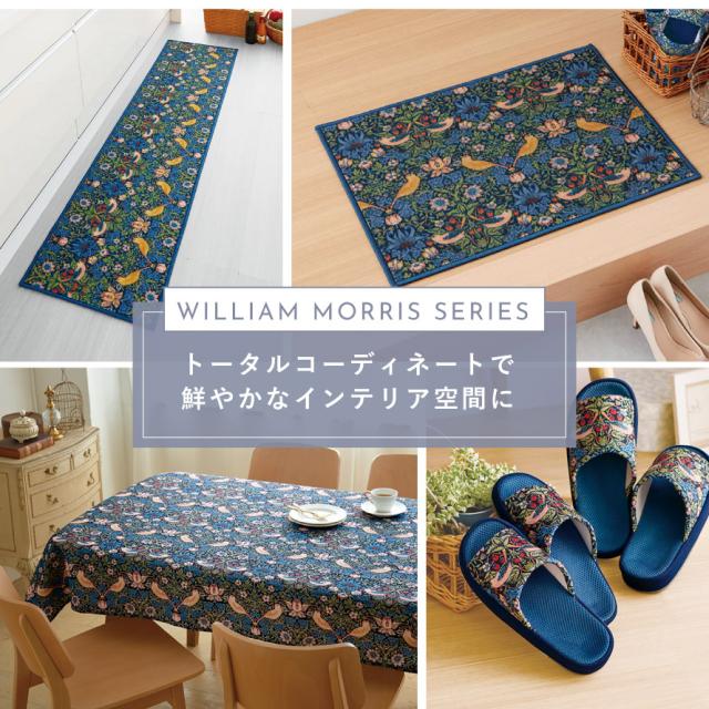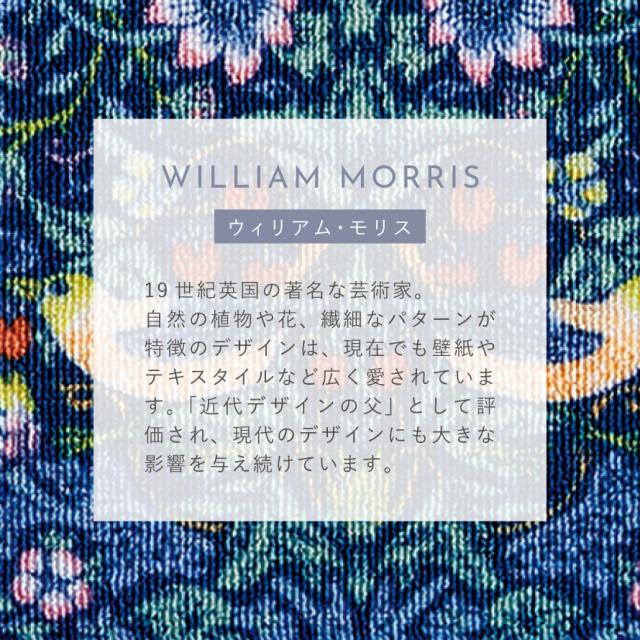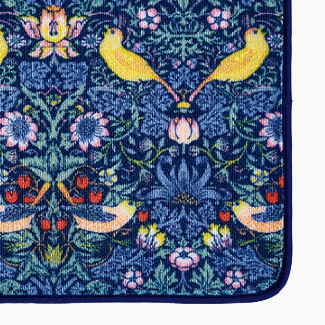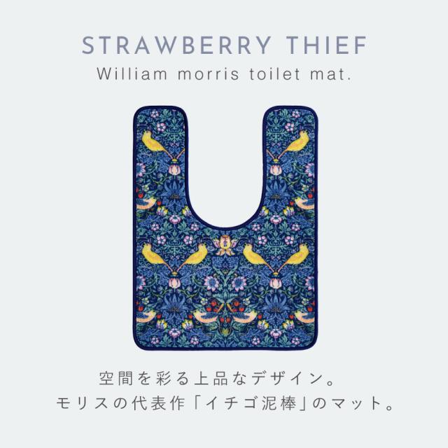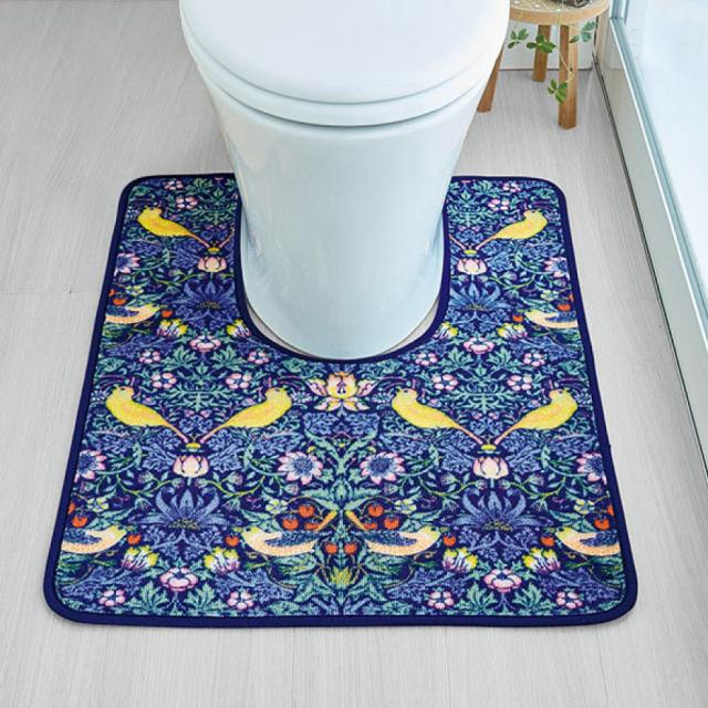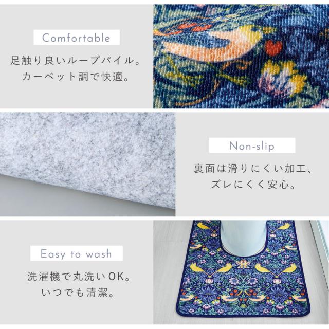 ウィリアム・モリスの代表作「いちご泥棒」のトイレマット。植物、鳥やイチゴの繊細で美しい絵柄が、インテリアに彩りを加えます。さらりとした足触りの良いループパイル仕様、カーペット調で快適な踏み心地。