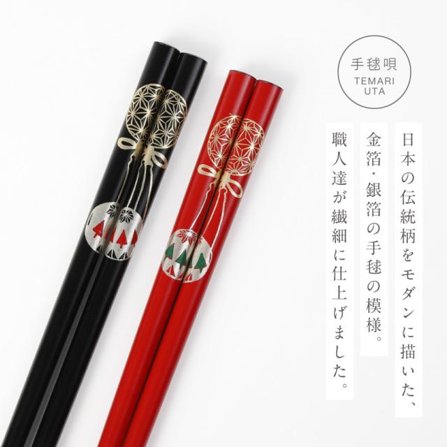 そこにモダンなデザインで金蒔絵を施して、普段使いから晴れの日使いにまで、美しさにこだわり続けた夫婦箸です。日本の伝統的な絵柄の「手毬」は優美な仕上がりで洗練された印象を与えます。