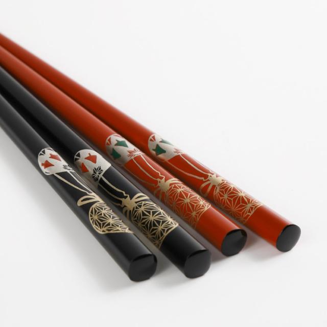 お箸を代表する福井県小浜の箸職人と輪島塗の職人たちのコラボレーションで誕生した輪島塗夫婦箸です。輪島塗ならではの塗り肌の良さ。