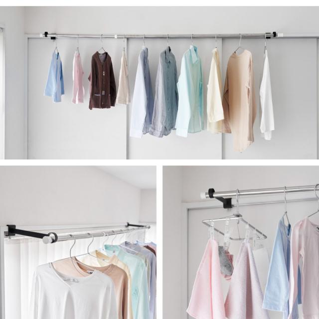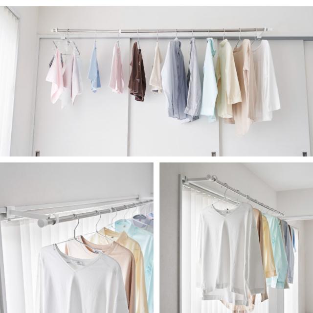 鴨居、窓枠など、お好みの位置に簡単取り付け。ポールを差し込むだけで室内物干し場ができます。足りない物干しスペースの確保に便利です。