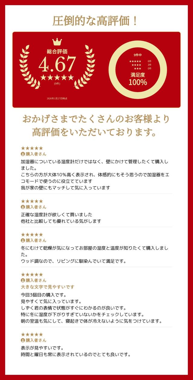高級感のある木目調デザインの温湿度計。TT-572では快適レベル表示、TT-592では快適表示をします。また、過去の最高・最低温湿度を表示する機能も付いているので、不在時でもお部屋の温湿度がどこまで変動したかがわかります。寝室やリビングの乾燥が気になる方や、ペットや観葉植物のお世話をしている方にもおすすめです。