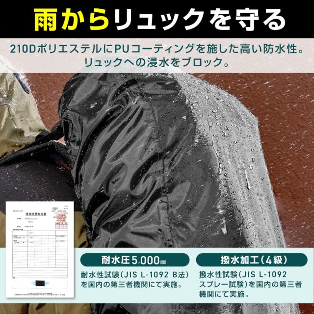 防水性に優れた「リュックカバー M(40L〜60L)」です。210ポリエステルにPUコーティングを施し、耐水圧5,000mmと撥水加工(4級)を実現しました。