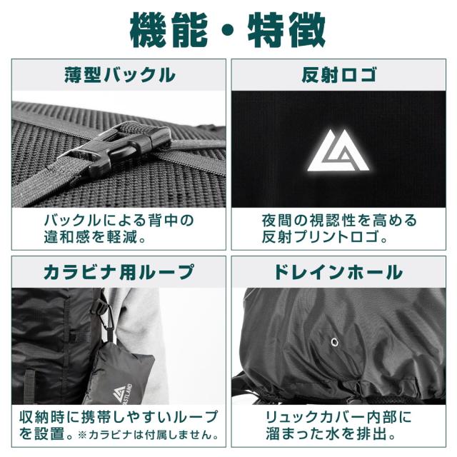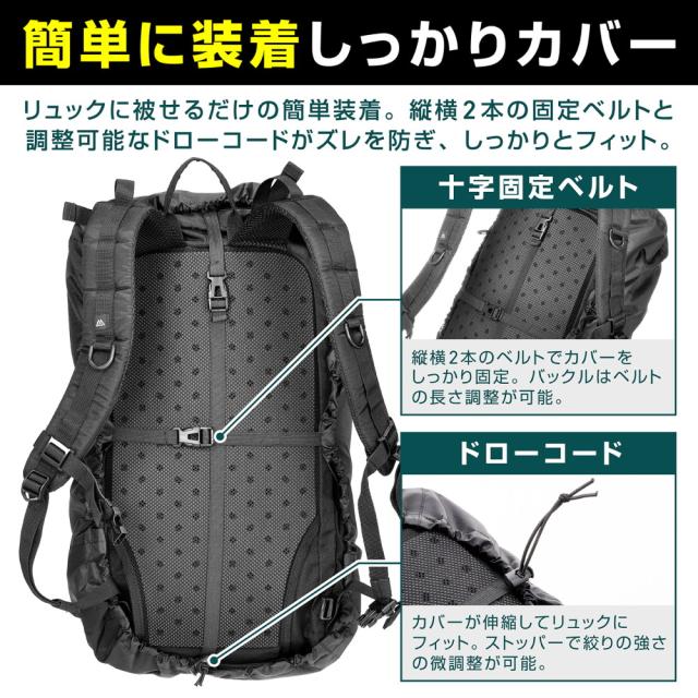 【簡単装着でしっかりカバー】リュックに被せるだけで簡単に装着できます。縦横2本の固定ベルトと、絞りの強さを調整できるドローコードがズレを防ぎ、しっかりとフィットします。