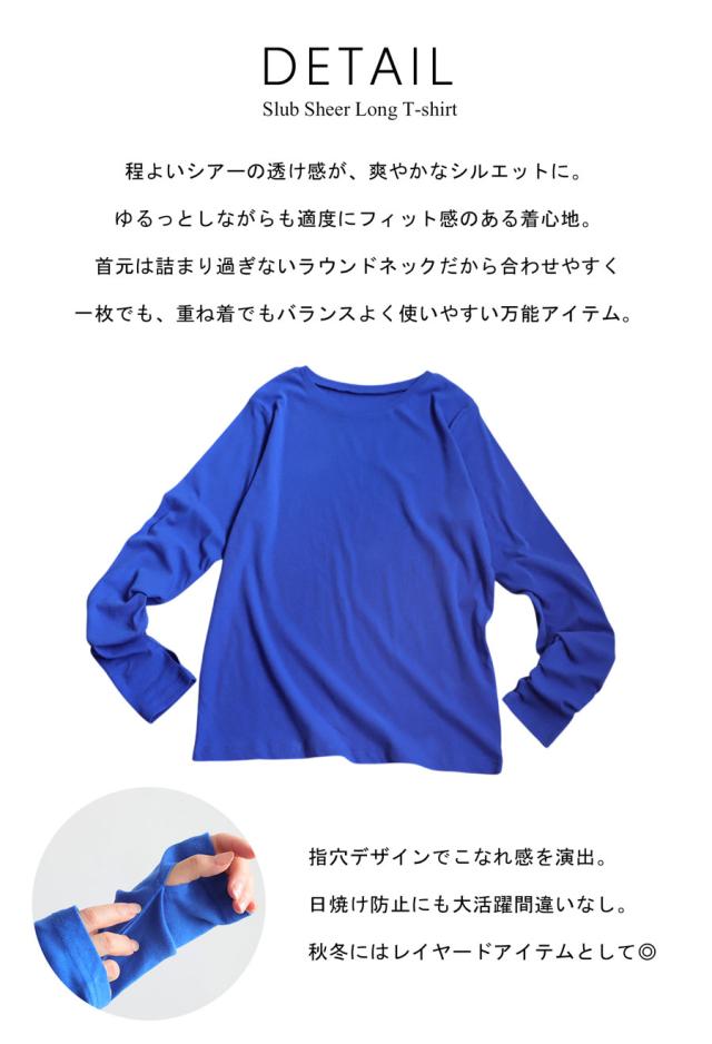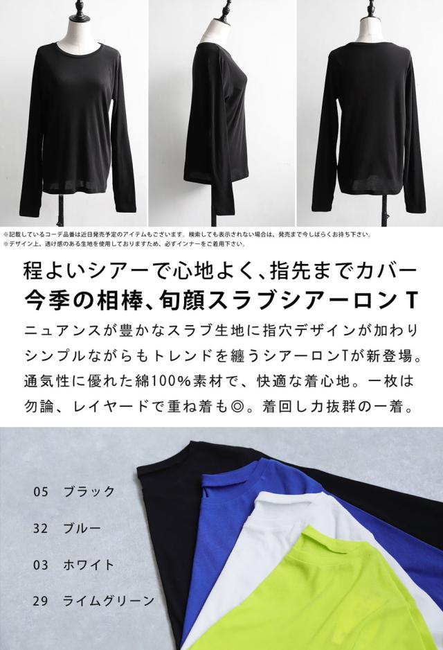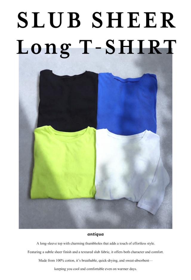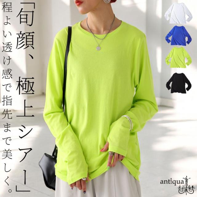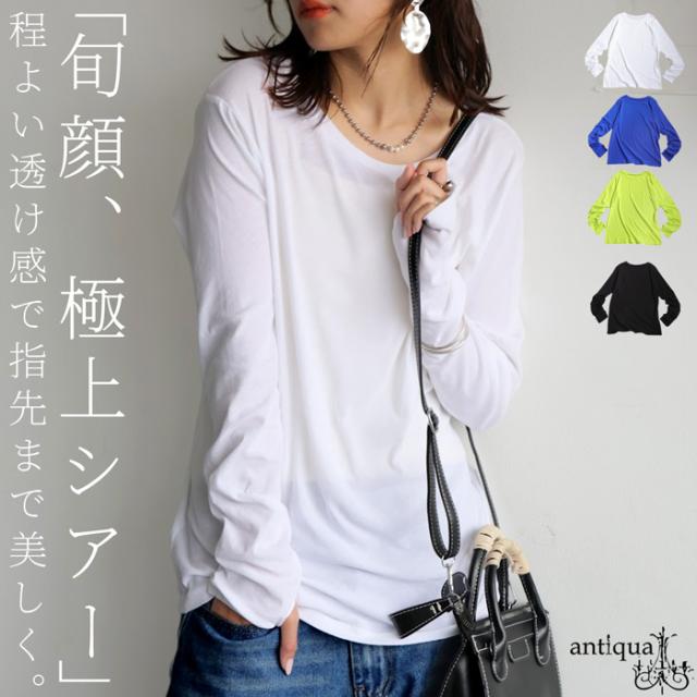 【検索ワード】スラブシアーロンT カットソー レディース トップス 長袖 シアー 丸首 ラウンドネック シンプル 着回し アレンジ インナー 重ね着 レイヤード 袖長め 伸縮性 軽量 通気性 フィット感 薄手 フィンガーホール 指穴 スラブ風 デイリー使い 抜け感 透け感 肌見せ 肌触り 柔らかい ヘルシー プルオーバー かぶり 日焼け防止 オーバーサイズ 大きめ 大きいサイズ Tシャツ ロンT 綿100 綿 コットン オフホワイト白 ブラック 黒 ライトグリーン 緑 ブルー 青 サイズ展開 Regular Plus antiqua アンティカ 大人 おしゃれ 10代 20代 30代 40代 50代 60代 春 夏 秋 冬 オールシーズン お洒落 カジュアル かわいい かっこいい あんてぃか