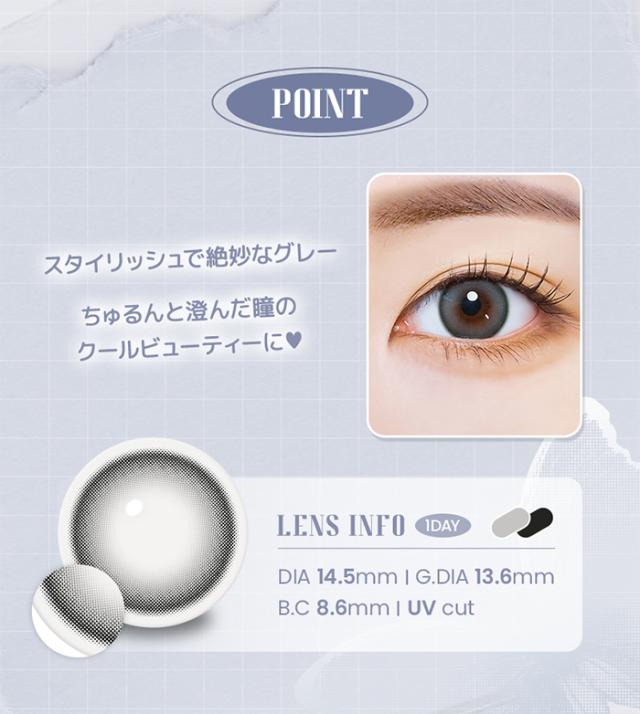 【商品詳細】 ●カラー:オリ・アッシュグレー ●直径:14.5mm ●着色直径:13.6mm ●ベースカーブ:8.6mm ●含水率:38% ●販売度数:-0.00〜-8.00 ●付属品:レンズ10枚 ●使用期限:1日使い捨て ●承認番号:30100BZX00038000 【区分】高度管理医療機器 【製造国】韓国 【製造販売元】フロムアイズ株式会社 【広告文責】株式会社トクダ TEL:06-6796-7555 【高度管理医療機器販売業許可】 第23N00119号 ■注意事項■ ●コンタクトレンズは高度医療管理機器です。 必ず眼科医の検査・処方を受けてお求めください。 ●商品の欠陥や不良など当社原因による場合には、返品・交換を受け付けさせていただきます。 商品到着後、5日以内にお電話ください。 なお、衛生用品の為、お客様都合による返品・交換は受け付けておりませんので、ご了承ください。 |