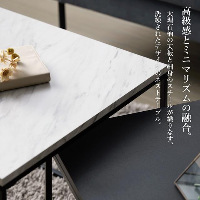 大理石調の天板と細身のスチールが織りなす、洗練されたネストテーブルです。