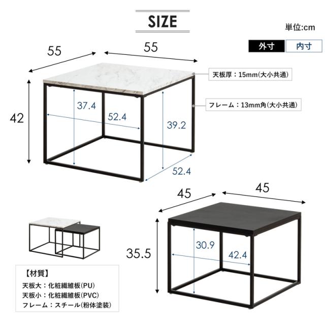 | 本体(大):幅55×奥行55×高さ42cm 本体(小):幅45×奥行45×高さ35.5cm 天板:厚さ15mm フレーム:13mm角 |