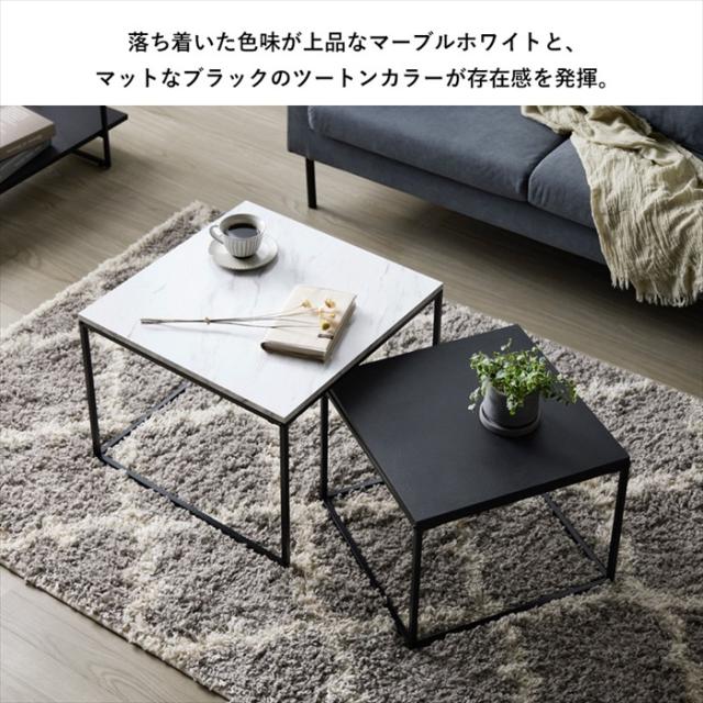 | 高級感とミニマリズムの融合。 大理石調の天板と細身のスチールが織りなす、洗練されたネストテーブルです。 サイズの異なる2つの正方形テーブルを重ねたりスライドさせながら、シーンに応じて使い分けができます。 上品なマーブルホワイトとマットなブラックのツートンカラーがお部屋をお洒落に演出。 安定試験実施済の頑丈設計もポイントです。 |