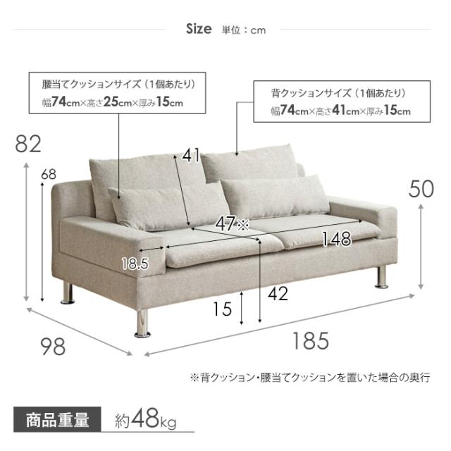 | 本体:幅185×奥行98×高さ82cm 座面:幅148×奥行47×高さ42cm 肘部:高さ50cm 脚部:高さ15cm |