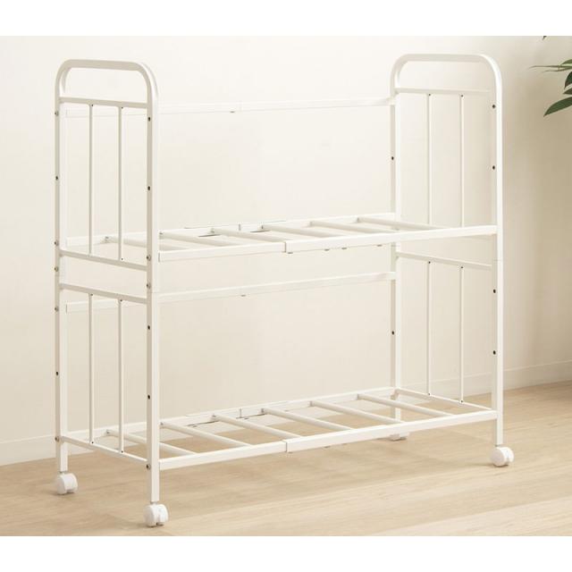 | かさばる布団や毛布・マットレスをすっきり収納できる布団収納ラック。 床に置きっぱなしだと気になる湿気やカビも、布団ラックを使えば通気性抜群でお悩み解決。 キャスター付きで移動も簡単なので、布団の上げ下げや持ち運びも楽々。 棚位置は3段階で高さが調節可能で、棚位置を上げて下に衣装ケースや収納ボックスを入れることもできます。 抜群の収納力で押入れやクローゼット内の整理にも最適。 お掃除ロボットやフローリングワイパーが潜り込める高さなので、下にホコリが溜まるのも防止できます。 収納量に合わせて高さは1段と2段、奥行も三つ折りマットレスや布団が収納できる深型(ノーマルタイプ)と、省スペースで場所を取らない浅型(スリムタイプ)をご用意しました。 ※このページは「2段・浅型(スリムタイプ)」を販売しております。 |