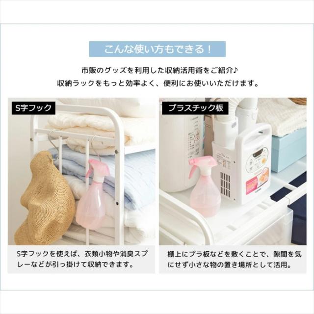 棚位置は3段階で高さが調節可能で、棚位置を上げて下に衣装ケースや収納ボックスを入れることもできます。