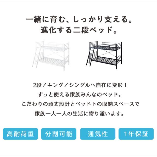 上下分割が可能で、二段ベッドだけでなく、キングベッドやシングルベッドとしても使用できます。