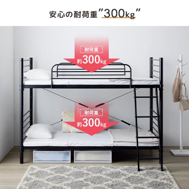 | シンプルなデザインが、どんなお部屋にも合う二段ベッドです。 大人でも安心して使用できる、各段の耐荷重は300kgです。 大人、子供、学生寮など、幅広い年齢層やシーンに対応しています。 床面には20枚の桟フレームを使用し、しっかりと体を支え、心地よい眠りをサポートします。 梯子は足が痛くなりにくい幅広でフラットな形状です。 マットレスの厚みに配慮した高めのサイドガードで、動きが活発なお子様も安心です。 上下分割が可能で、二段ベッドだけでなく、キングベッドやシングルベッドとしても使用できます。 床面の高さを調節することで、収納スペースを有効活用できます。 |