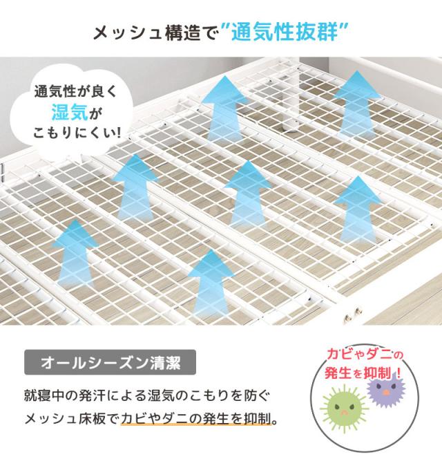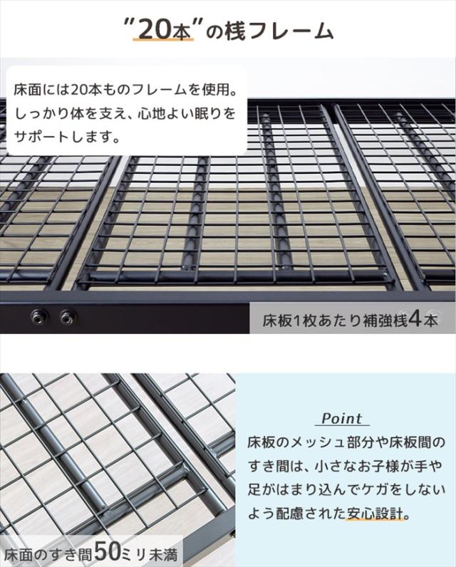 | ・床面高さ2段階調整可 ・通気性抜群のメッシュ床板 ・フレームの強度を高めた揺れの少ない頑丈設計 ・床板のすき間を狭くし安全面に配慮 |