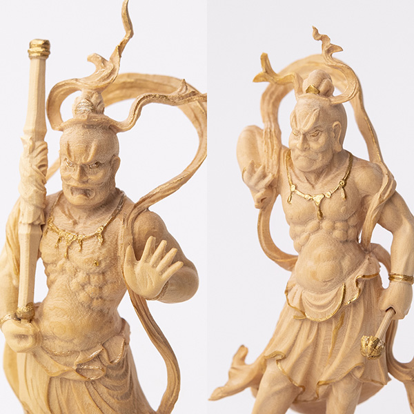 素材は細密彫刻に適したツゲを用い、最も重要なご尊顔とバランスを実物のイメージそのままに彫り上げました。彩を添える金泥彩色は、仏像彩色師 篁千礼監修のもと、姉妹ブランド「イスム」の工房が担当しています。