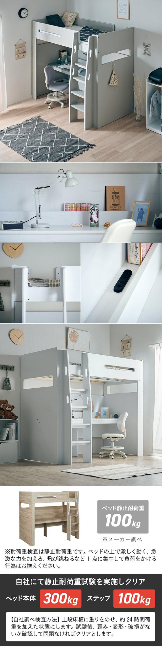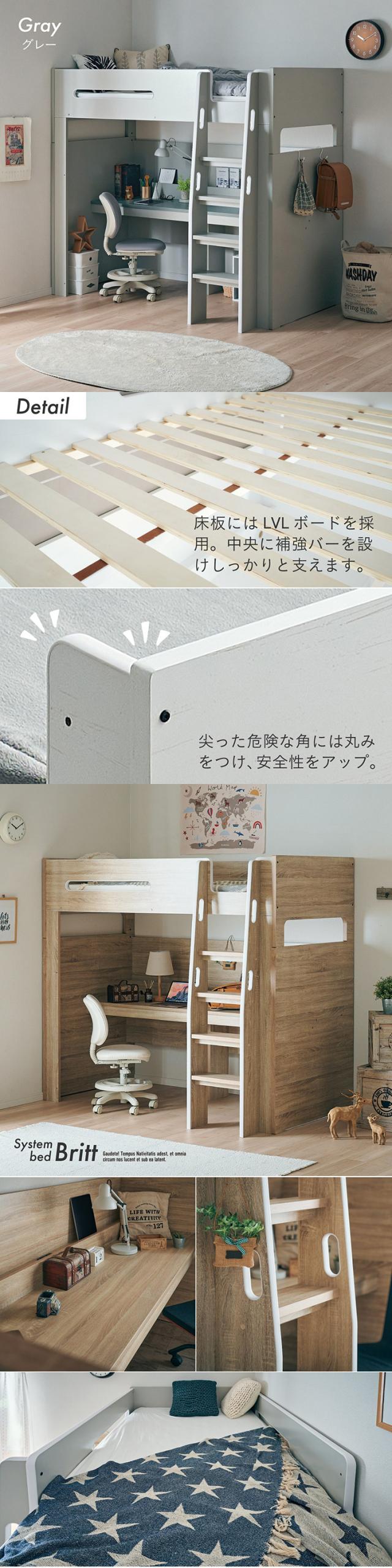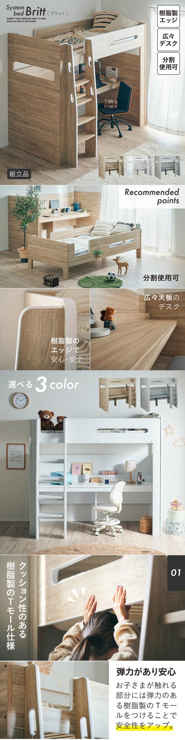 【コンセント付き/分割使用OK】ロフトベッド デスク付き システムベッド Britt(ブリット) 3色対応 システムベット ハイタイプ システムベッドデスク 学習デスク 学習机 木製 机 大人 子ども 子供部屋