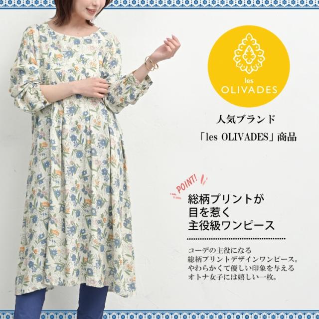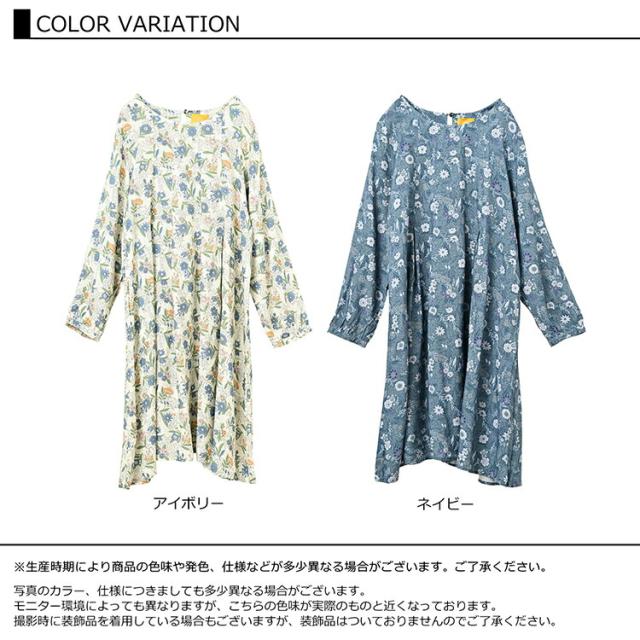 大きいサイズ レディース 総柄プリントタックワンピース メール便対応 長袖 ロング丈 花柄 lesOLIVADES LL/3L/4L/5L ゆったりサイズ ぽっちゃり女子 プラスサイズ