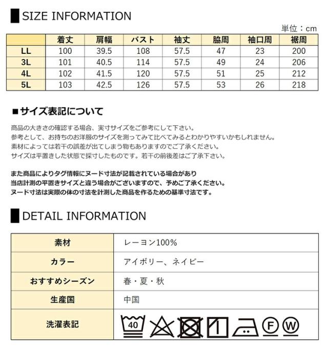 3L:着丈101 肩幅40.5 バスト114 袖丈57.5 脇周49 袖口周24 裾周206