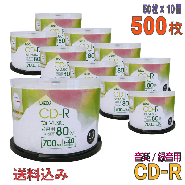 【記録メディア】 Lazos(ラソス) CD-R 音楽用 700MB 1-40倍速 スピンドルケース ワイドホワイトレーベル 【500枚(50枚×10個)スピンドルケース】 (L-MCD50P 10個セット) 【送料込み※沖縄・離島・一部地域を除く】 【KSW】