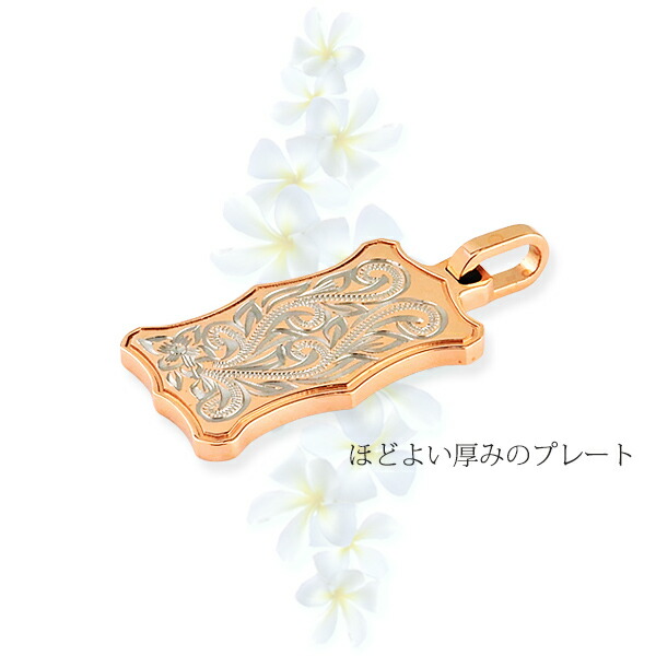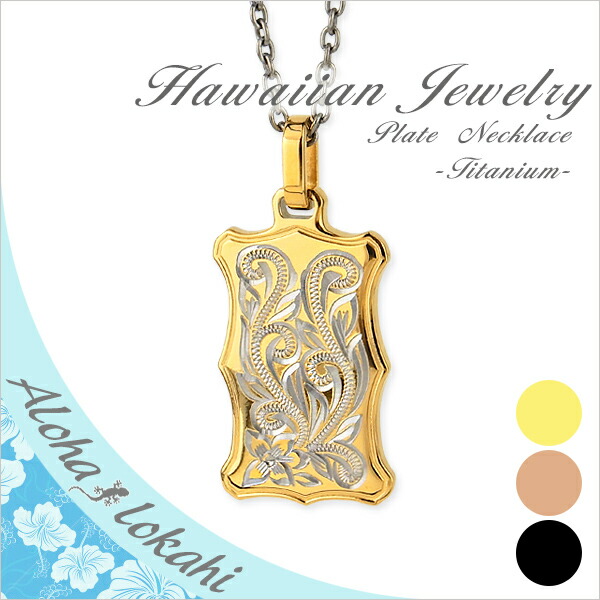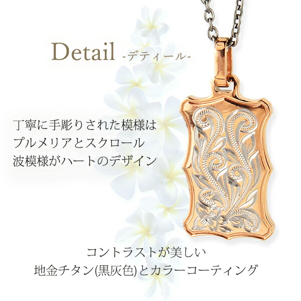 ハワイアンジュエリー ネックレス カラーチタン プレート プルメリア スクロール ハート チタン製チェーン付き アクセサリー ペンダント ピンクゴールド ブラック イエローゴールド 名入れ シンプル ペンダント 刻印