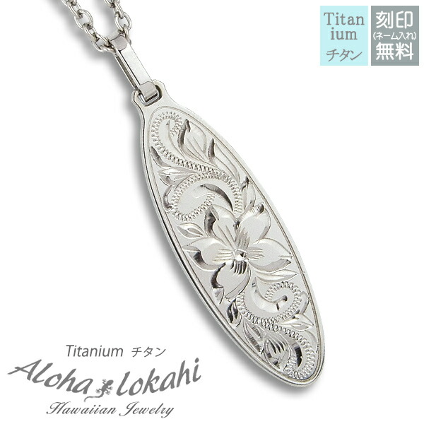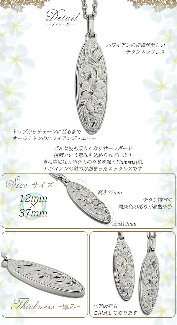 | 商品名 | ハワイアンジュエリー ハワイアン ネックレス チタン 刻印無料 サーフボード プルメリア スクロール チタン製チェーン付き チタンアクセサリー |