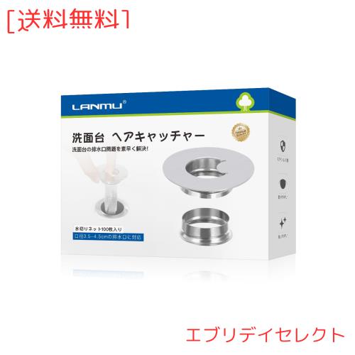 LANMU 洗面台 ヘアキャッチャー 洗面台 排水口 ゴミ受け ステンレス製 洗面所 排水口ネットホルダー 100枚 水切りネット付き 髪の毛キャ