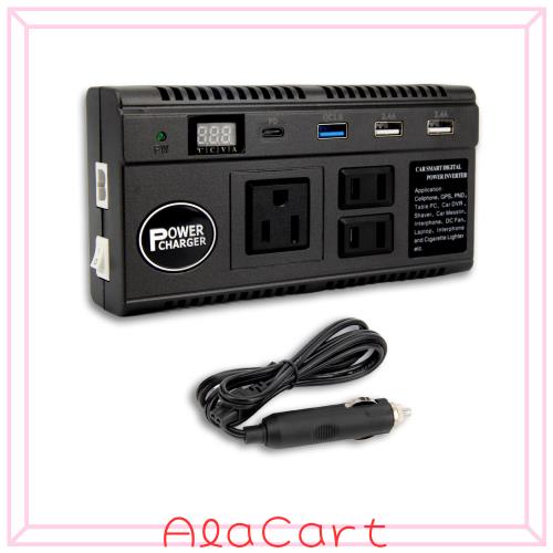 【新登場モデルPDポート追加!】自動車のバッテリーのDC12V/24V直流電力をAC110V交流電力に変換して、定格120Wのパワー供給、DC12V/24Vどちらも使用可能のカーインバーターです。12V車/24Vトラックに対応可能。給電口九つ:USB給電口×3、3口ACコンセント×1、2口ACコンセント×2、シガーライターソケット×2、PDポートx1。スマホ、タブレット、電子書籍リーダー、ノートパソコンなどを同時に充電できますので、大切な電子機器の電池切れの心配がないドライブを楽しめます。ON/OFFスイッチを搭載しているので省エネに使用できます、シガーソケットに差したまま電源を切ることも出来ます。ONの時点灯する電源指示ランプも付いているので分かりやすいです。ご注意:本製品は修正弦波なので、テレビ、プリンターなど精密機器は使えません。また、12V車のシガーソケットに接続してご使用の際に、100v以上の家電製品の作動は不安定になる場合もあります。100v以下の家電製品(パソコン、携帯、カメラ、受話器、レーザー、小型ファンなど)使ってください。