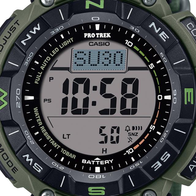 ベースモデルのPRG-340と同様に、見やすいデュプレックスLCディスプレイを採用。上部の液晶で方位をグラフィック表示し、下部の液晶で時刻や計測値を大きく表示する二層構造の液晶により、視認性が向上しています。薄型化した液晶の採用により、厚みを抑えながらも高機能を実現しました。