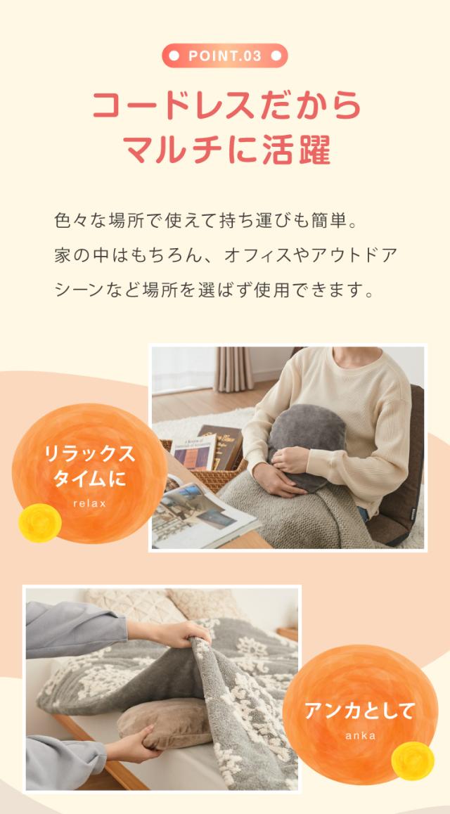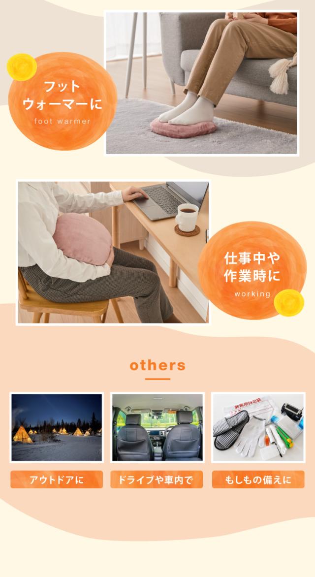 膝の上に乗せてカイロとして使ったり、布団の中でアンカとして使ったり、湯たんぽの上に足を乗せてコタツ代わりに足先を暖めたりすることも可能です。