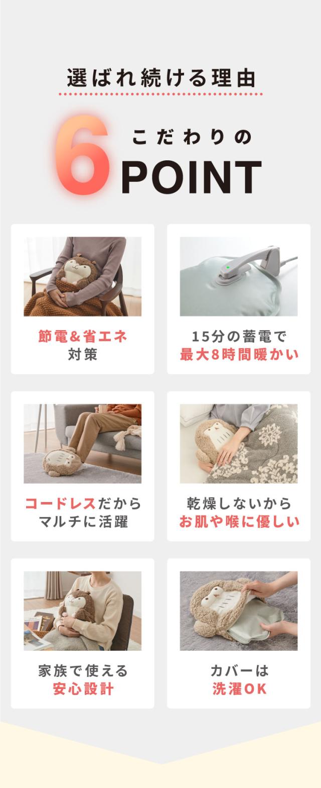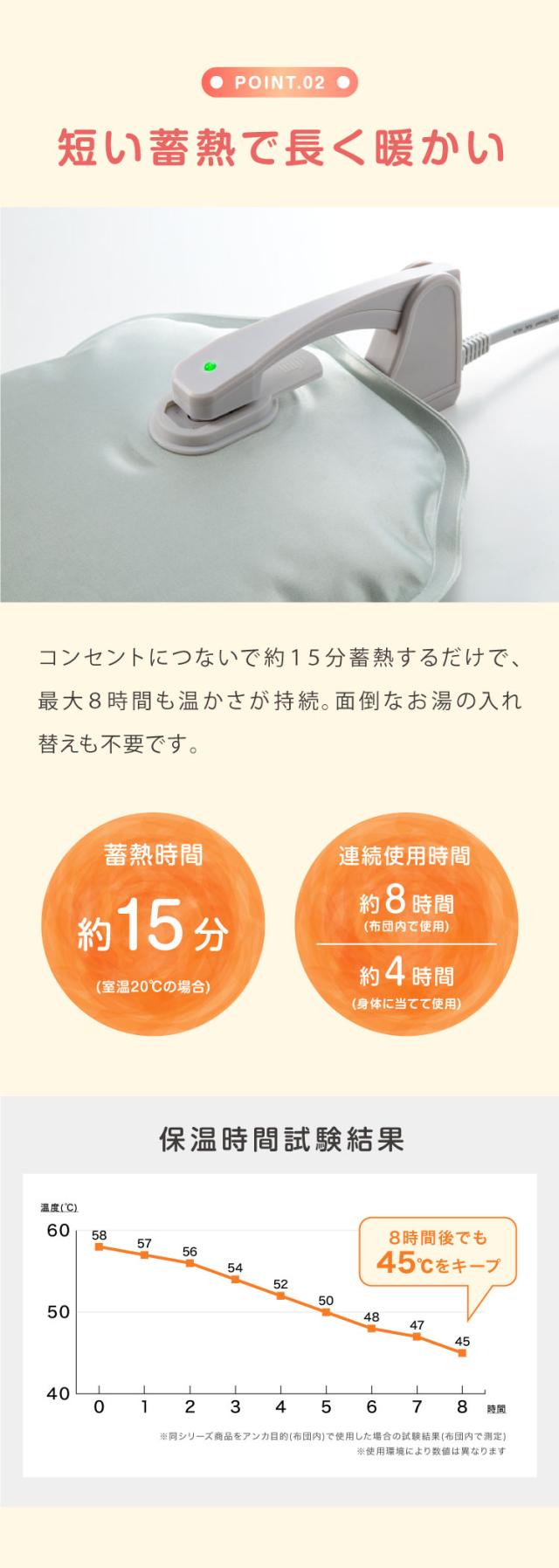 面倒なお湯の入れ替えは一切不要で、15分間蓄熱するだけで最長8時間も暖かさが持続します。