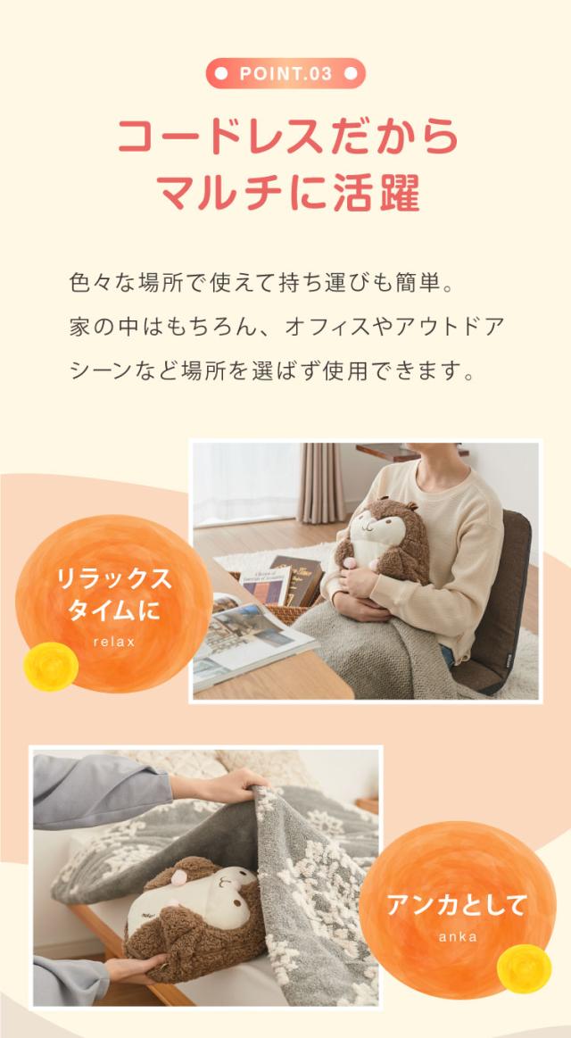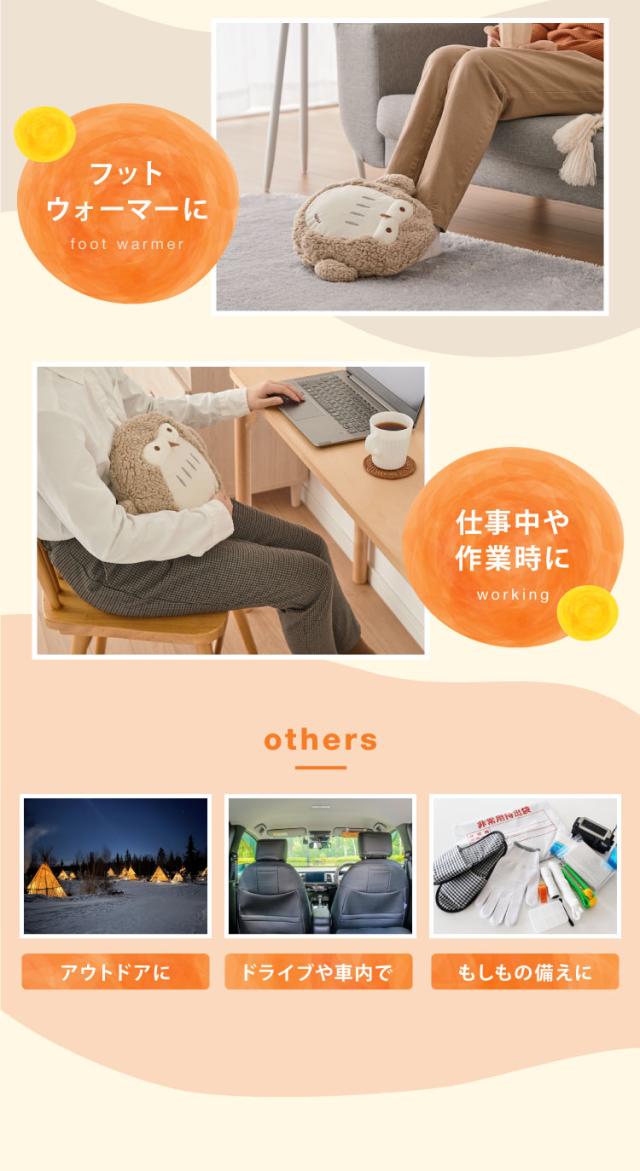膝の上に乗せてカイロとして使ったり、布団の中でアンカとして使ったり、湯たんぽの上に足を乗せてコタツ代わりに足先を暖めたりすることも可能です。