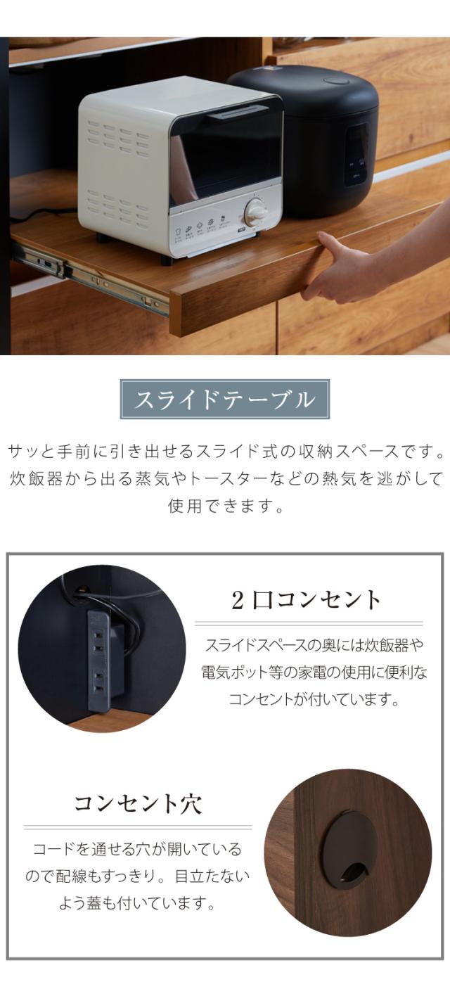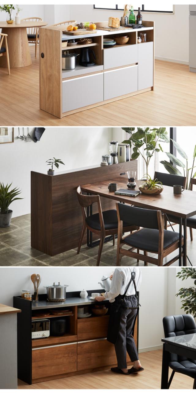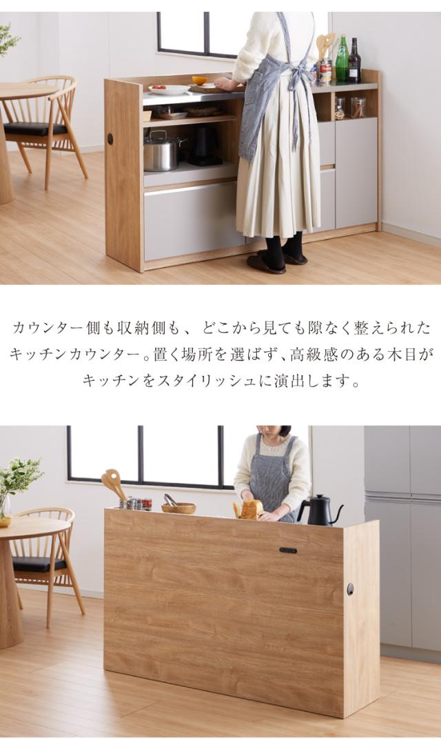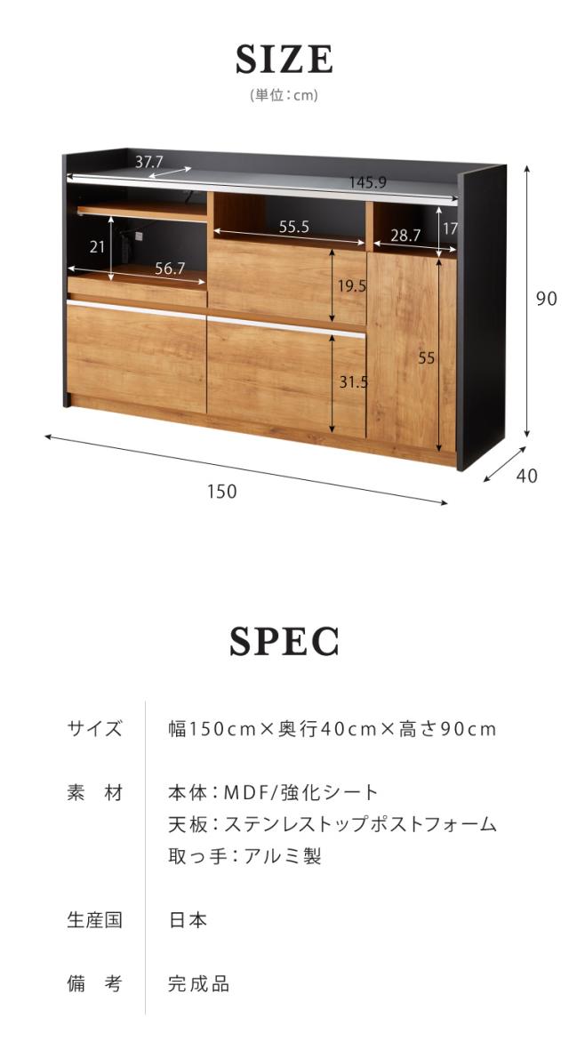 手元を隠す キッチンカウンター 間仕切り 完成品 幅150 ステンレス天板 モイス加工 スライド棚 耐水 耐熱 コンセント付き 引き出し 食器棚 キッチンボード グレー オーク ブラウン(代引不可)