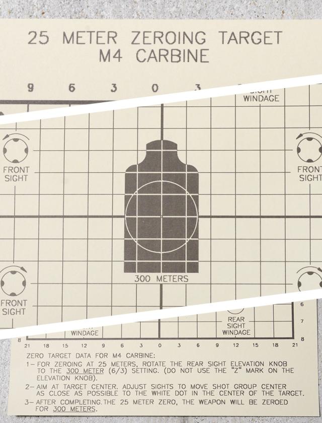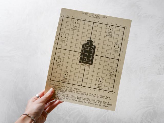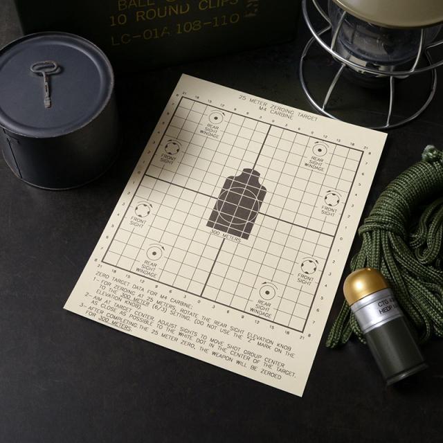 米軍で使用される陸軍、海兵隊、空軍の正式な主力小銃として採用されているM4カービン、M16A2/M16A4用が裏表にプリントされた照準調整用ターゲットシートが登場。丈夫で重厚な紙製で、ファイルなどに挟んで持ち運びできる便利なサイズ感。スコープやダットサイトを覗いた時の目標点と、実際の着弾点のズレを調整するために使用されます。独特な質感とミリタリーアイテムならではの雰囲気が魅力的で、額装してお部屋やガレージ、また店舗装飾など、インテリアとして飾っても画になる一枚です。