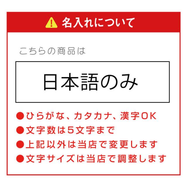 | 名入れ | プリントするお名前は「入力欄」へご記入下さい。 日本語のみ ※ローマ字不可 文字数は5文字までとさせていただきます。 |
