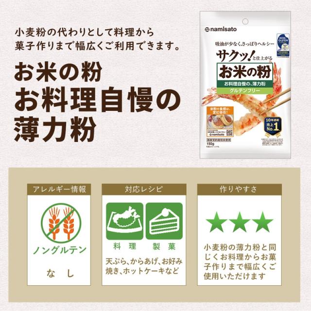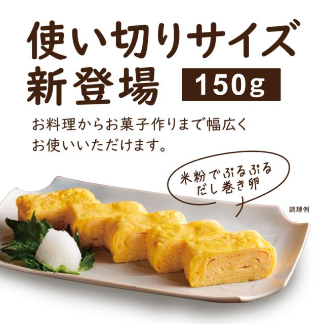 天ぷらの衣づくりや、シフォンケーキ作り、米粉クッキーなど、初めて米粉を使用される方におすすめの、150g使い切りの小袋タイプです。