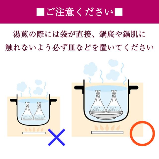 湯煎調理で鍋などを使用する際は、必ず耐熱皿などを使用し、袋が鍋底などに直接触れないように注意してください。