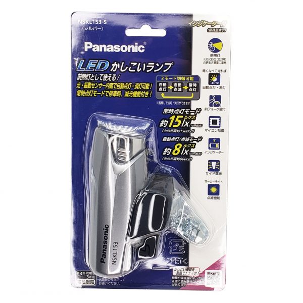 ●カラー:ブラック。●明るさ:【点灯モード】約8lx/約800cd(10m前方)、【常時点灯モード】約15lx/約1,500cd(10m前方)。●取付位置:フロントフォークのランプブラケット。●本体寸法(約):(幅)40×(奥行)110×(高さ)42mm。●質量:約135g(パナソニックアルカリ乾電池含む)。●使用光源:白色LED×1個。●使用電源:単3形乾電池×3本(別売)。●電池寿命(23℃時):【自動点灯】約32時間、【自動点滅】:約160時間、【常時点灯】:約16時間(パナソニックアルカリ乾電池使用時)。●JIS規格適合商品。
