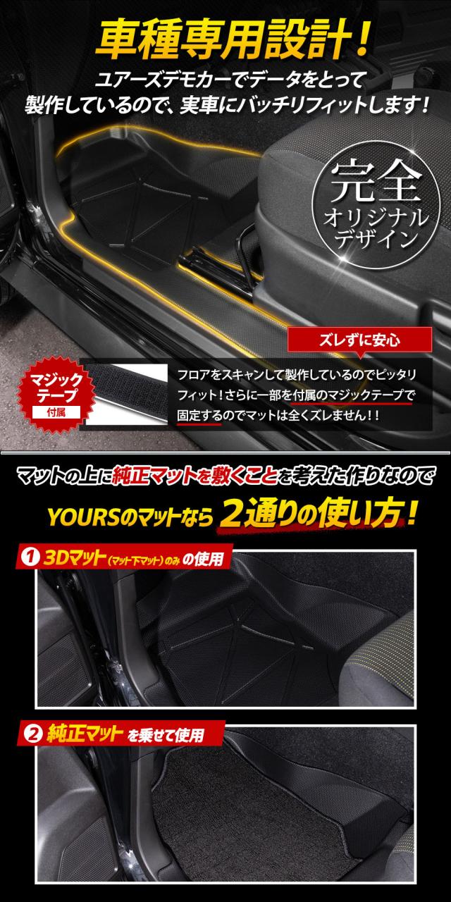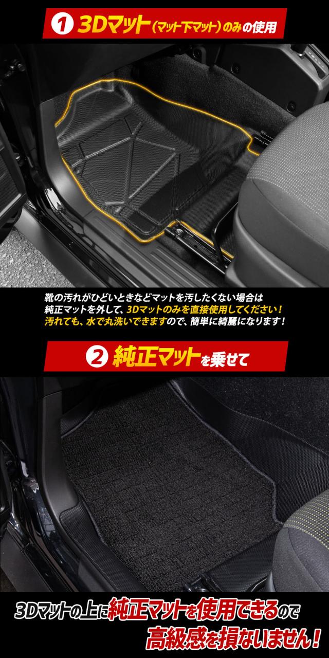 ・フロアをスキャンして製作しているのでピッタリフィット! ・マットの一部には付属のマジックテープで車体と固定するのでマットは全くズレません! ■純正マットの端から落ちるゴミや砂をガッチリガード!! ・隙間なくフィットするので、ゴミや砂が直接車両床に落ちることはありません。 ・3Dデザインなので縁の数センチの立ち上がりで水や汚れをしっかりキャッチ! ■乗降時のサイドステップの擦れ傷や汚れもしっかりガードする「スカッフありタイプ」新登場! ・足元だけでなく、サイドステップ部分(スカッフ部)もカバーし、擦り傷・泥・雨水からしっかり守ります。 ■完全防水なのでお手入れも簡単! ・水や汚れは軽いものならウエスなどで拭くだけでOK! ・全面的に汚れた場合は丸洗いも可能なので衛生的です。 ■新素材の熱可塑性エラストマー(TPE)を使用。 ・弾力があり、曲げたりすることも可能なので、お車からの取り外しも容易です。 ・ゴムのように車内が臭くなりません。 ・耐久性抜群なので何十万キロ走っても大丈夫です。 |