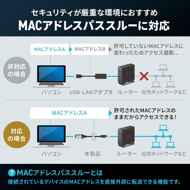 ●MACアドレスパススルー機能に対応しているので、ネットワークのセキュリティ管理に最適です。
