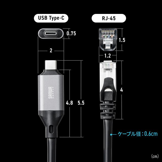 ●USB Type-CポートをLANポート(RJ-45コネクタ)に変換するケーブルです。●LAN(RJ-45)ポートがないパソコンでも、変換アダプタなしで直接有線ネットワーク接続ができます。