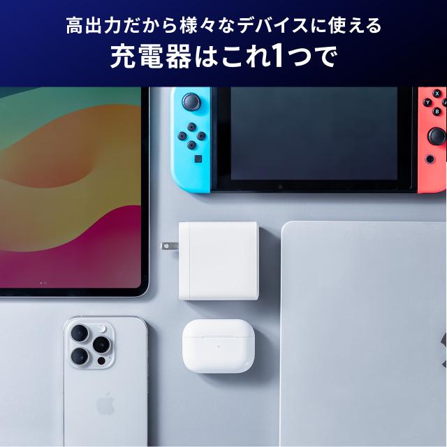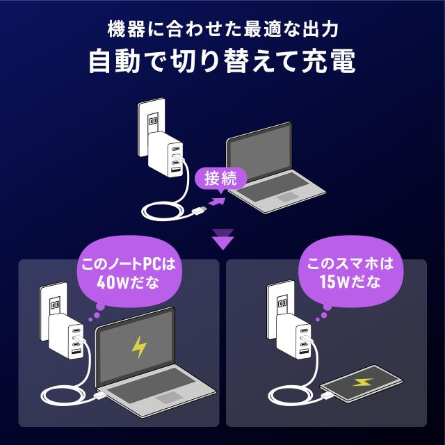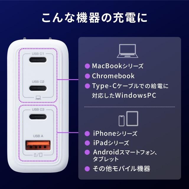 ●1台でノートパソコンからタブレット・スマートフォンまであらゆるデバイスの充電に対応できる高出力・マルチポート仕様のUSB充電器です。●1ポート使用時は最大100WまでのUSB PD規格による充電に対応し、一般的なノートパソコンをはじめ、高い電力を必要するハイスペックノートパソコンまでの充電に対応します。
