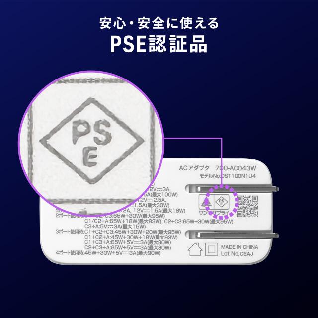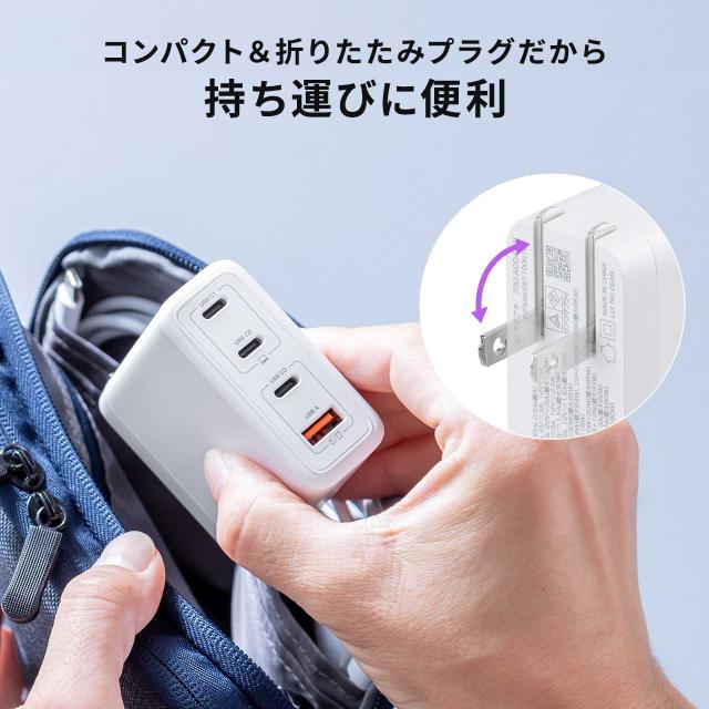 USB-C充電器 PD 充電器 100W 4ポート Type-C×3 USB-A×1 GaN採用 折りたたみ式プラグ 急速充電 ノートパソコン 複数ポート PSE適合商品 ホワイト[700-AC043W]