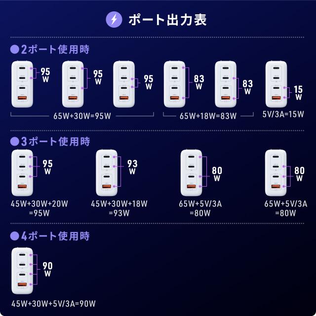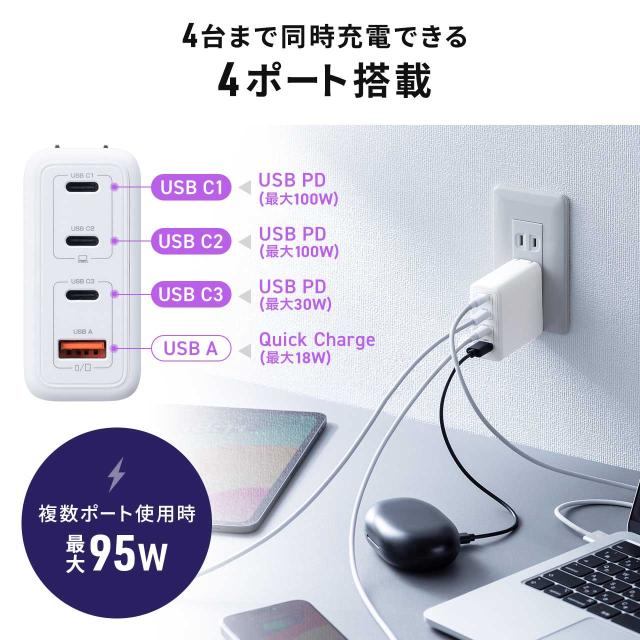 ●USB Type-Cを3ポートとUSB-Aを1ポート搭載した合計4ポート仕様で、複数ポート使用時も合計で最大95Wまでの出力に対応するので、幅広い機器の充電に対応し、最大4台の機器を同時に充電することができます。