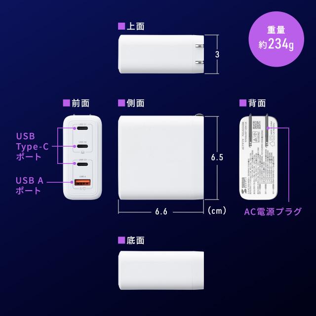 ⇒ご購入の前にご確認下さいUSB Power Delivery規格による最大100W出力に対応。USB PD対応のノートパソコン、タブレット、スマートフォンを充電可能なUSB Type-Cポートを3つ、Quick Charge対応のUSB Aポートを1つ搭載したマルチポート仕様のUSB充電器。次世代半導体GaN(窒化ガリウム)によって高出力ながらも小型化を実現。【WEB限定商品】